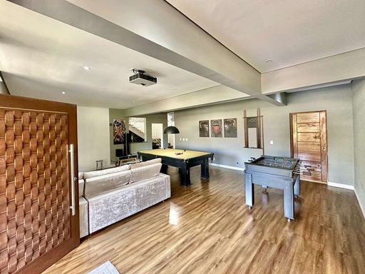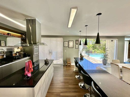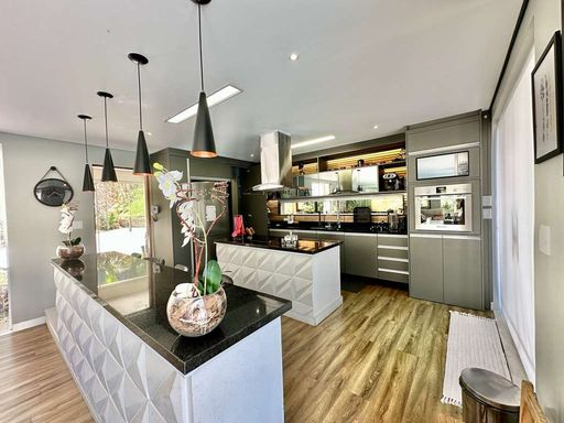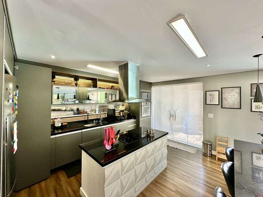 O living integra cinco ambientes voltados para o lazer, com varanda gourmet e piscina. Estar, TV com lareira, bar, jantar e cozinha se conectam harmoniosamente, criando o espaço ideal para receber. A cozinha planejada é completa, com balcão para cinco lugares, ilha com fogão por indução, coifa inox, forno elétrico Brastemp, micro-ondas, tampo em granito e duas cubas inox com torneira gourmet. A área de serviço ensolarada conta com lavanderia fechada e armários.