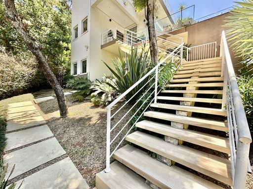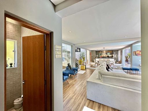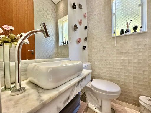 São quatro acessos — social, lazer, salão de festas e serviço — com entrada social por escada de alvenaria e guarda corpo de ferro, levando ao hall de entrada. A casa é envidraçada, ensolarada e bem arejada. O lavabo é decorado com tampo de mármore e espelho, e o escritório planejado oferece espaço funcional.