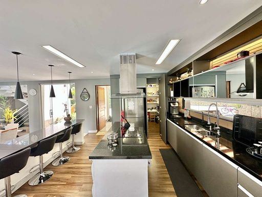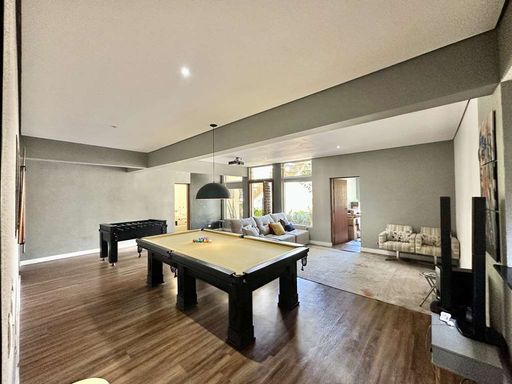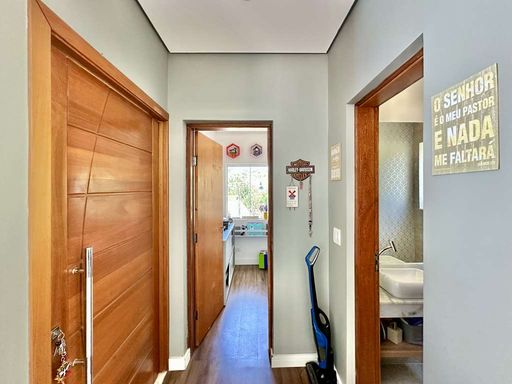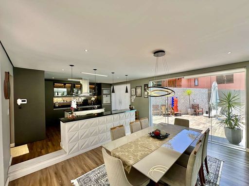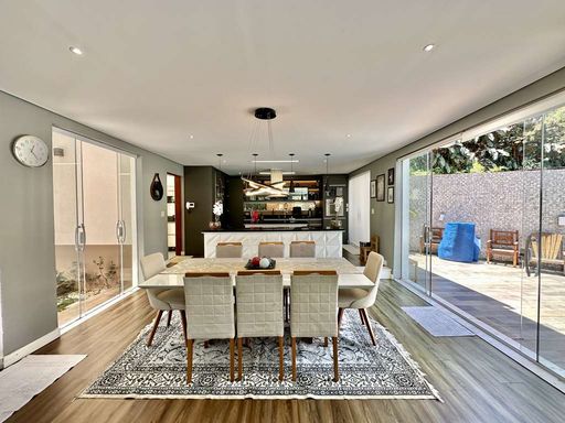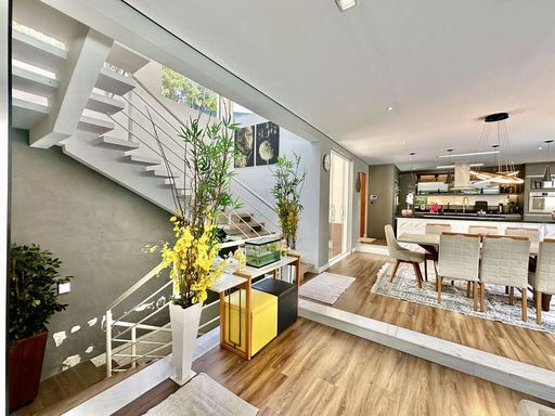 No piso inferior, um salão com bar, banheiro completo e depósito é perfeito para hóspedes, festas, jogos ou academia, com acesso pela varanda. A casa tem porteiro eletrônico, portão automático e garagem coberta para três veículos. A energia solar fotovoltaica com 34 placas torna a residência eficiente, devolvendo energia para a rede.