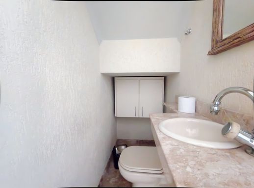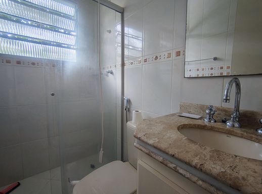 Subindo as escadas, chegamos ao piso superior, onde estão localizados dois dormitórios. O banheiro que atende este piso é moderno e funcional, garantindo conforto para os moradores.