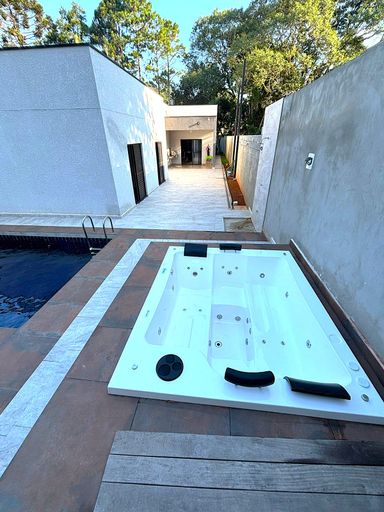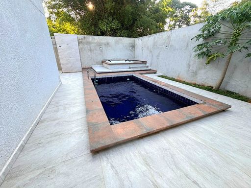 A área externa é um verdadeiro refúgio de lazer e bem-estar. O quintal amplo combina áreas revestidas em porcelanato com espaços verdes, criando equilíbrio entre sofisticação e natureza. A piscina com iluminação integrada permite uso tanto durante o dia quanto à noite, enquanto o spa com aquecimento elétrico e cromoterapia oferece momentos de relaxamento. O espaço gourmet é ideal para confraternizações e conta com banheiro de apoio exclusivo para a área da piscina.