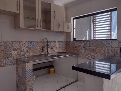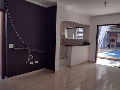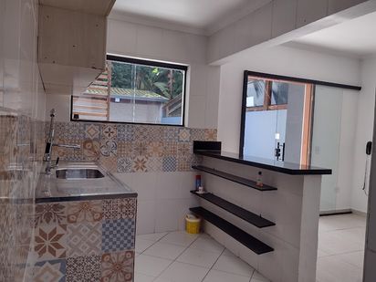A cozinha, equipada com armários planejados, garante funcionalidade e organização, facilitando o preparo das refeições diárias. A lavanderia coberta, localizada ao lado da cozinha, adiciona praticidade à rotina, oferecendo um espaço adequado para as atividades domésticas.