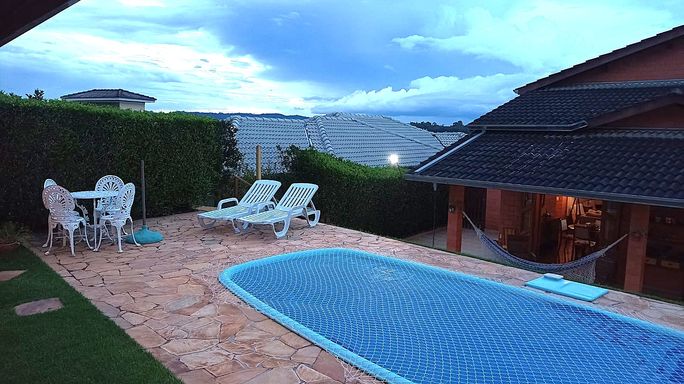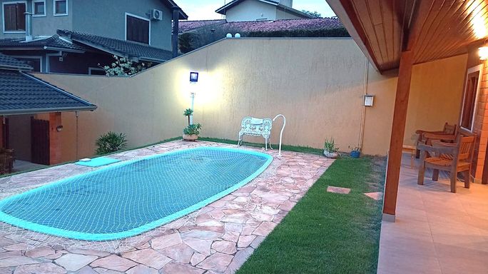 A área externa foi pensada para oferecer lazer completo sem sair de casa. A piscina conta com trocador de calor, permitindo seu uso em diferentes épocas do ano, enquanto a área gourmet com churrasqueira é perfeita para momentos de confraternização com família e amigos.