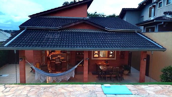 O imóvel dispõe de quatro vagas de garagem, sendo uma coberta, atendendo bem às necessidades da família.