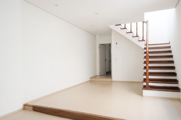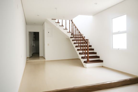 A sala de estar e a sala de jantar são generosas em metragem, com piso laminado que proporciona aconchego e elegância. A escada que dá acesso ao pavimento superior é revestida em madeira, reforçando a estética acolhedora do imóvel. A cozinha é funcional, com armários planejados e piso em porcelanato, que garante resistência e beleza ao ambiente.