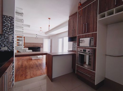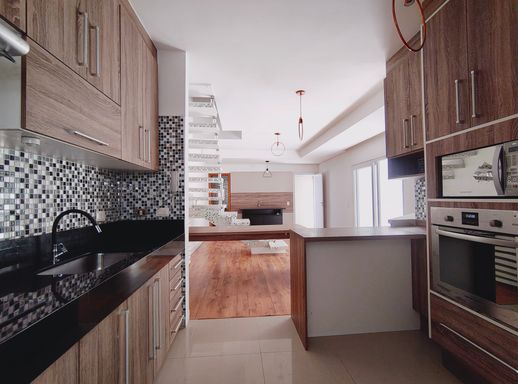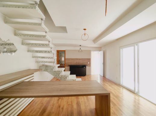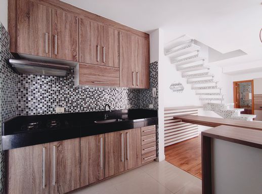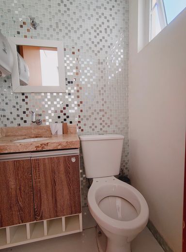 A cozinha é um dos pontos altos desta casa, repleta de armários planejados da melhor qualidade, proporcionando um ambiente funcional e sofisticado para as atividades culinárias. No mesmo piso, há um lavabo que atende à parte inferior da casa, oferecendo conveniência para moradores e visitantes. A lavanderia coberta está estrategicamente posicionada para facilitar as tarefas do dia a dia.