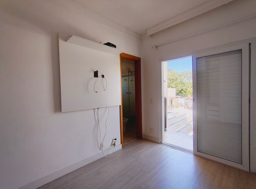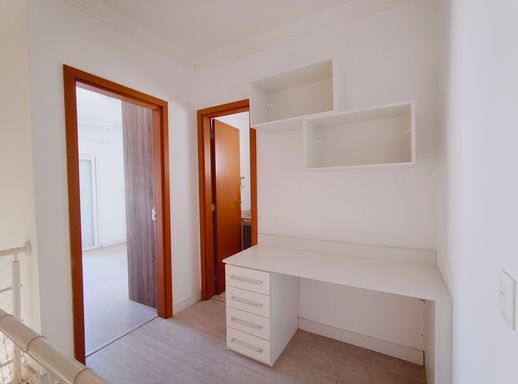 Seguindo para a parte superior da casa, através de uma imponente escada, encontramos os 3 dormitórios. A suíte principal é equipada com móveis planejados, garantindo muito espaço e organização. Os outros dois dormitórios também possuem móveis planejados, proporcionando conforto e praticidade. Os banheiros são completos, com box e armários com pia de alta qualidade, assegurando um ambiente funcional e elegante.